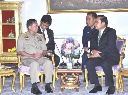 ထိုင္းႏိုင္ငံသို႔ ခ်စ္ၾကည္ေရးခရီးေရာက္ရွိေနေသာ တပ္မေတာ္ကာကြယ္ေရးဦးစီးခ်ဳပ္ ဗိုလ္ခ်ဳပ္မွဴးႀကီး မင္းေအာင္လိႈင္ သည္ ေမ (၂၆) ရက္ ေဒသစံေတာ္ခ်ိန္ မြန္းလြဲ (၂) နာရီတြင္ ႏိုင္ငံေတာ္အစိုးရရံုးသို႔ သြားေရာက္ၿပီး ထိုင္းႏိုင္ငံ ၀န္ႀကီးခ်ဳပ္ General Prayuth Chan-o-Cha အား ဂါရ၀ျပဳေတြ႔ဆံုသည္။