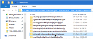 ၿပီးသြားရင္ အဆိုပါ ID ကို ကူးယူရန္အတြက္ Win + E နဲ႔ explorer ကို ဖြင့္လိုက္ပါ။ Explorer ဖြင့္ၿပီးရင္ Address bar မွာ C:\Users\ <Username>\AppData\Local\Google\Chrome\User Data\Default\ Extensions ဆိုတဲ့ လမ္းေၾကာင္းအတိုင္း သြားရပါမယ္။ User Name ကေတာ့ ကိုယ့္ရဲ႕ကြန္ပ်ဴတာမွာ သံုးထား တဲ့ user name ကို ထည့္သြင္းရပါမယ္။ Extensions ဆိုတဲ့ လမ္းေၾကာင္းေအာက္ကို ေရာက္ၿပီဆိုရင္ မွတ္ထားတဲ့ ID နဲ႔ ဖိုင္ကို လိုက္ရွာၿပီး select ျပဳလုပ္ပါ။