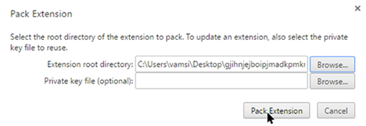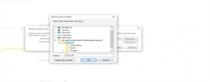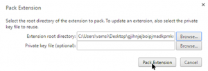 Pack Extension pop-up တက္လာရင္ Extension root directory ဆိုတဲ့ေနရာမွာ Browser ကို ႏွိပ္ၿပီး ခုနက ကူးထားတဲ့ extension ဖိုင္ကို ေခၚရပါမယ္။ အဆိုပါ ဖိုင္ရဲ႕ version number ေနရာအထိ select ျပဳလုပ္ေပးရပါမယ္။