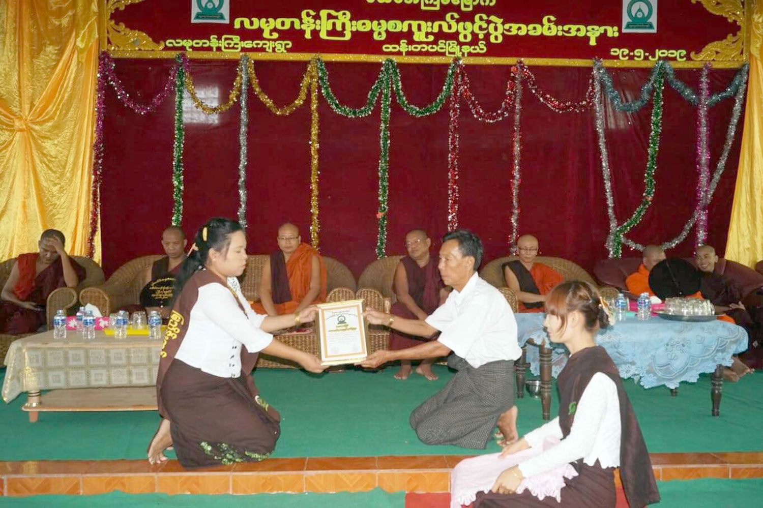 အဆို ပါအခမ္းအနားသုိ႔ ထန္းတပင္ၿမိဳ႕နယ္ ျပည္ေထာင္စုၾကံ့ခိုင္ေရးႏွင့္ဖြံ႕ၿဖိဳးေရးပါတီမွ ၿမိဳ႕နယ္ပါတီေကာ္မတီဝင္ ဘ႑ာေရးမွဴး ေဒၚေအးသီတာထြန္း တက္ေရာက္ခဲ့ၿပီး ျပည္ခိုင္ၿဖိဳးပါတီမွ အာဟာရဒါန လွဴဒါန္းခဲ့ရာ ေက်းရြာ ဓမၼစကူးလ္အဖြဲ႕ တာဝန္ရွိသူတစ္ဦးက ဂုဏ္ျပဳမွတ္တမ္းလႊာ ေပးအပ္ခဲ့သည္ကို ေဒၚေအးသီတာထြန္းမွ လက္ခံ ရယူၿပီး ဖြင့္ပြဲအခမ္းအနားကို နံနက္ ၁ဝ နာရီတြင္ ၿပီးဆံုးေၾကာင္း သိရသည္။ ေဇာ္သိန္း(ထန္းတပင္)