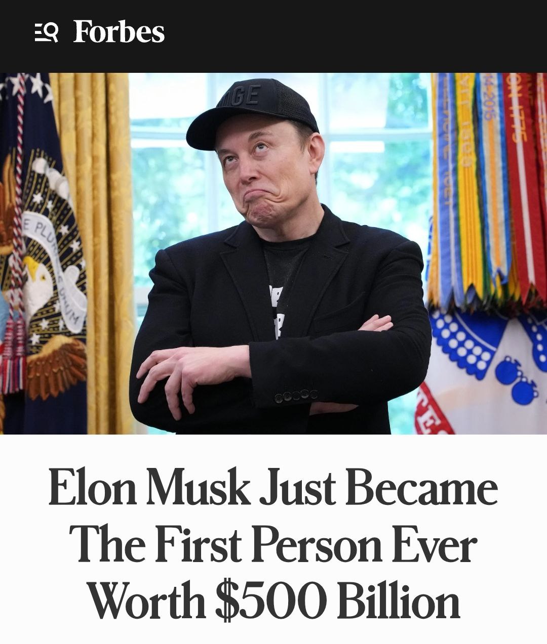 အမေရိကန် စွန့်ဦးတီထွင်လုပ်ငန်းရှင် အီလွန် မတ်စ် ဟာ ဒေါ်လာ ဘီလီယံ ၅၀၀ တန်ကြေးအထိ ပိုင်ဆိုင်တဲ့ ကမ္ဘာ့ပထမဆုံးလူသား ဖြစ်လာကြောင်း Forbes မဂ္ဂဇင်းက ရေးသားဖော်ပြပါတယ်။