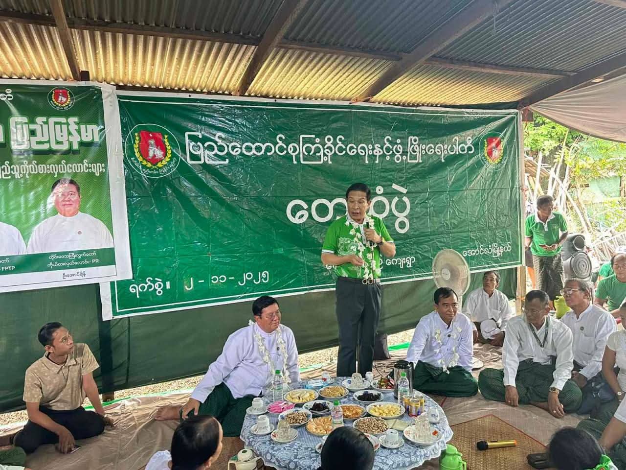 ေအာင္လံခရိုင္ပါတီဥကၠဌ တိုင္းေဒသႀကီးလႊတ္ေတာ္(FPTP)ကိုယ္စားလွယ္ေလာင္း ဦးစန္းလြင္မွ ေက်ာက္ဆည္ေက်း႐ြာဖြံ႕ၿဖိဳးတိုးတက္ေရးအတြက္အစြမ္းကုန္ေဆာင္႐ြက္ေပးသြားမည္ျဖစ္ၿပီး ျပည္သူလူထု၏အက်ိဳးစီးပြားအား တိုးတက္ျမင့္မားေအာင္ ေဆာင္႐ြက္နိုင္စြမ္းရွိေသာ မိမိတို႔၏ပါတီအား မဲေပးၾကရန္ႏွင့္ မဲေပးပုံနည္းစနစ္မ်ားကို တက္ေရာက္လာသူမ်ားကိုရွင္းလင္း ေျပာၾကားခဲ့ၿပီး တက္ေရာက္လာၾကသူမ်ားႏွင့္အျပန္အလွန္ေဆြးႏြေးၿပီး ေန႕လည္ ၁၂ နာရီတြင္ ေတြ႕ဆုံပြဲၿပီးဆုံးခဲ့ပါသည္။