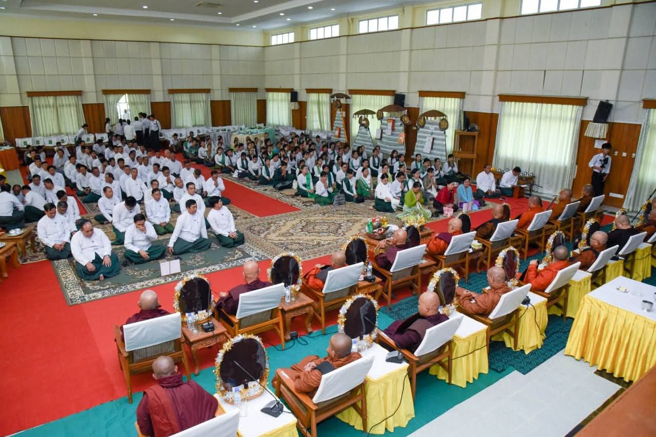 အခမ္းအနားကို နေမာတႆ (၃)ႀကိမ္႐ြတ္ဆိုဘုရားကန္ေတာ့၍ အခမ္းအနားဖြင့္လွစ္ၿပီး ေနျပည္ေတာ္၊ လယ္ေဝးၿမိဳနယ္၊ ေပါက္ၿမိဳင္ပရိယတၱိစာသင္တိုက္ ပဓာနနာယက၊ အဘိဓဇမဟာရ႒ဂု႐ု၊ အဂၢမဟာပ႑ိတ၊ မဟာဂႏၶဝါစက၊ ဥပ္ပါတသန္တိစေတီတော်မြတ်ကြီး၏ ဩဝါဒါစရိယဆရာေတာ္ ဘဒၵႏၱဇနိႏၵထံမွ အဂၤါ(၅)ပါးႏွင့္ ျပည့္စုံေသာသီလေတာ္ျမတ္အား ခံယူေဆာက္တည္ၾကၿပီး ဆရာေတာ္အရွင္သူျမတ္မ်ားက ပရိတ္တရားေတာ္မ်ား ႐ြတ္ပြားခ်ီးျမႇင့္ခဲ့ပါသည္။