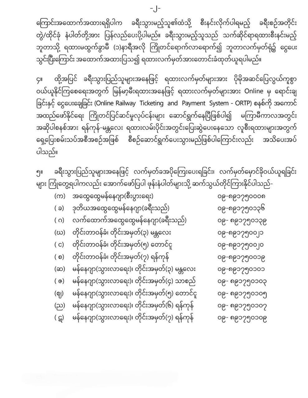 ရထားလက္မွတ္ဝယ္ယူမႈႏွင့္ပတ္သက္၍ လက္မွတ္ခအပိုေၾကးေပးရျခင္းႏွင့္ လက္မွတ္ေမွာင္ခိုဝယ္ယူ ရျခင္းမ်ား ႀကဳံေတြ႕ရပါက ဆက္သြယ္တိုင္ၾကားရန္ ဖုန္းနံပါတ္မ်ားကိုလည္း ထုတ္ျပန္ထားရွိပါတယ္။