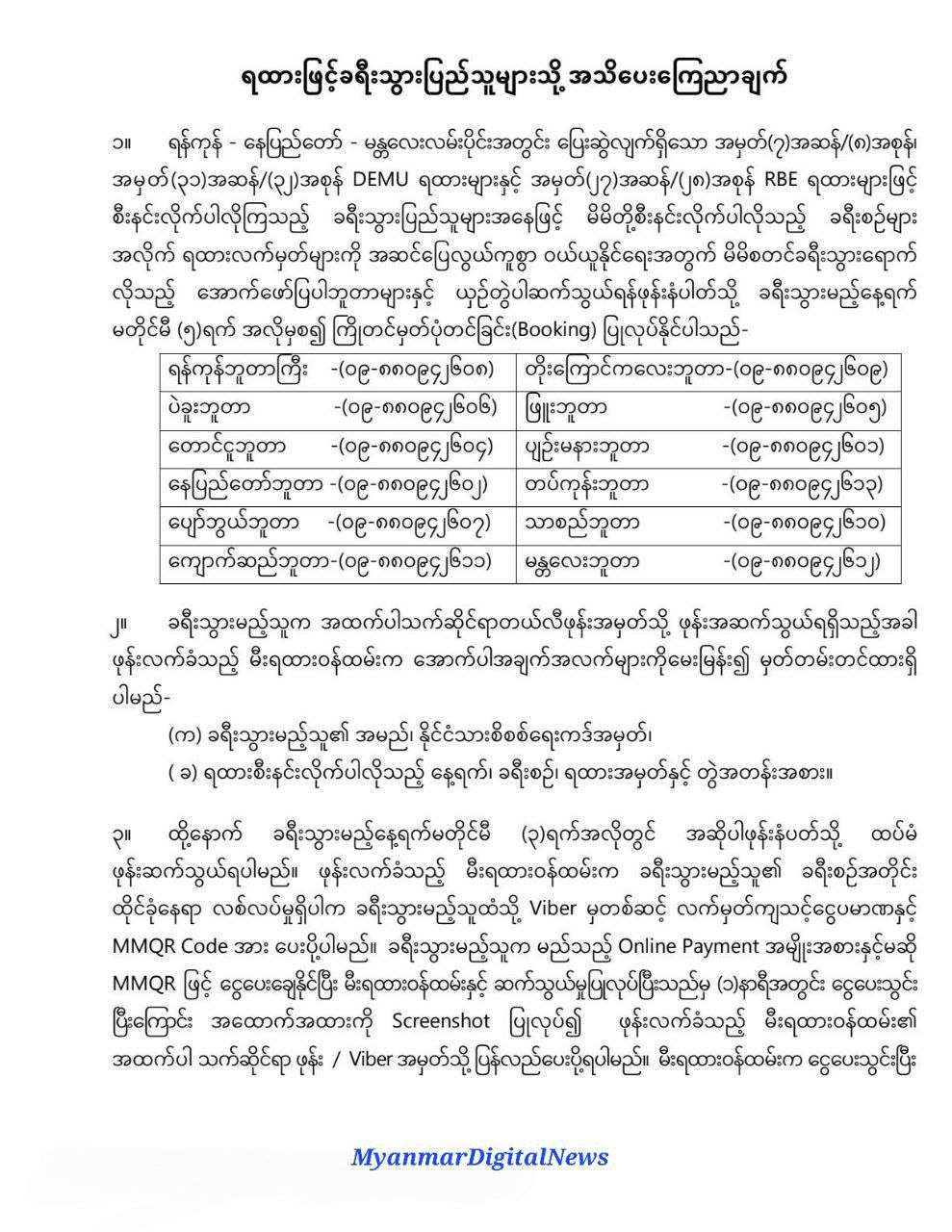 ရန္ကုန္-ေနျပည္ေတာ္-မႏၲေလးလမ္းပိုင္းတြင္ ေျပးဆြဲလ်က္ရွိတဲ့ အမွတ္(၇)အဆန္၊ (၈)အစုန္၊ အမွတ္(၃၁) အဆန္/(၃၂)အစုန္ DEMU ရထားမ်ားႏွင့္ အမွတ္(၂၇)အဆန္/(၂၈)အစုန္ RBE ရထားမ်ားႏွင့္ စီးနင္းလိုက္ပါလိုသူ ခရီးသြားျပည္သူမ်ားအေနနဲ႔ လိုက္ပါစီးနင္းလိုသည့္ ခရီးစဥ္မ်ားအတြက္ ရထားလက္မွတ္မ်ားကို ဖုန္းမွတစ္ဆင့္ ႀကိဳတင္ဝယ္ယူႏိုင္ၿပီျဖစ္ေၾကာင္း ျမန္မာ့မီးရထားမွ အသိေပးေၾကညာခ်က္ ထုတ္ျပန္ထားပါတယ္။