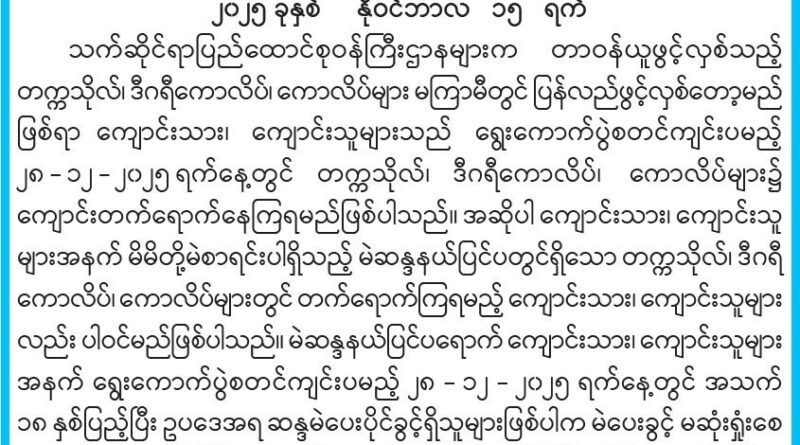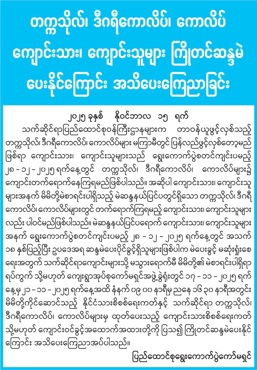 • တကၠသိုလ္၊ ဒီဂရီေကာလိပ္၊ ေကာလိပ္ ေက်ာင္းသား၊ ေက်ာင္းသူမ်ား ႀကိဳတင္ဆႏၵမဲ ေပးႏိုင္ေၾကာင္း အသိေပးေၾကညာျခင္း