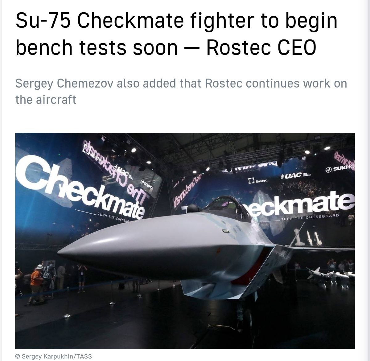 Su-75 Checkmate တို-က္ေလယာဥ္ စမ္းသပ္မႈမ်ား မၾကာမီ စတင္မည္ျဖစ္ေၾကာင္း ႐ုရွားႏိုင္ငံပိုင္ Rostec ေကာ္ပိုေရးရွင္း၏ အမႈေဆာင္အရာရွိခ်ဳပ္ (CEO) Sergey Chemezov က ဒူဘိုင္းေလေၾကာင္းျပပြဲ ၂၀၂၅ (Dubai Airshow 2025) တြင္ ေျပာၾကားခဲ့သည္။