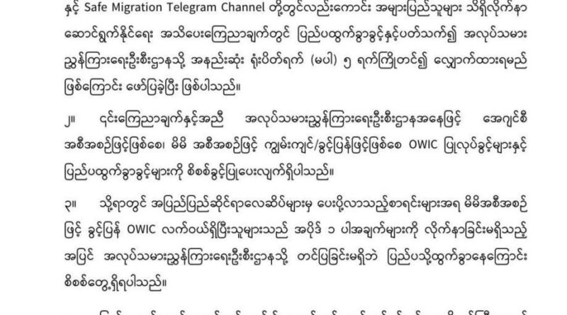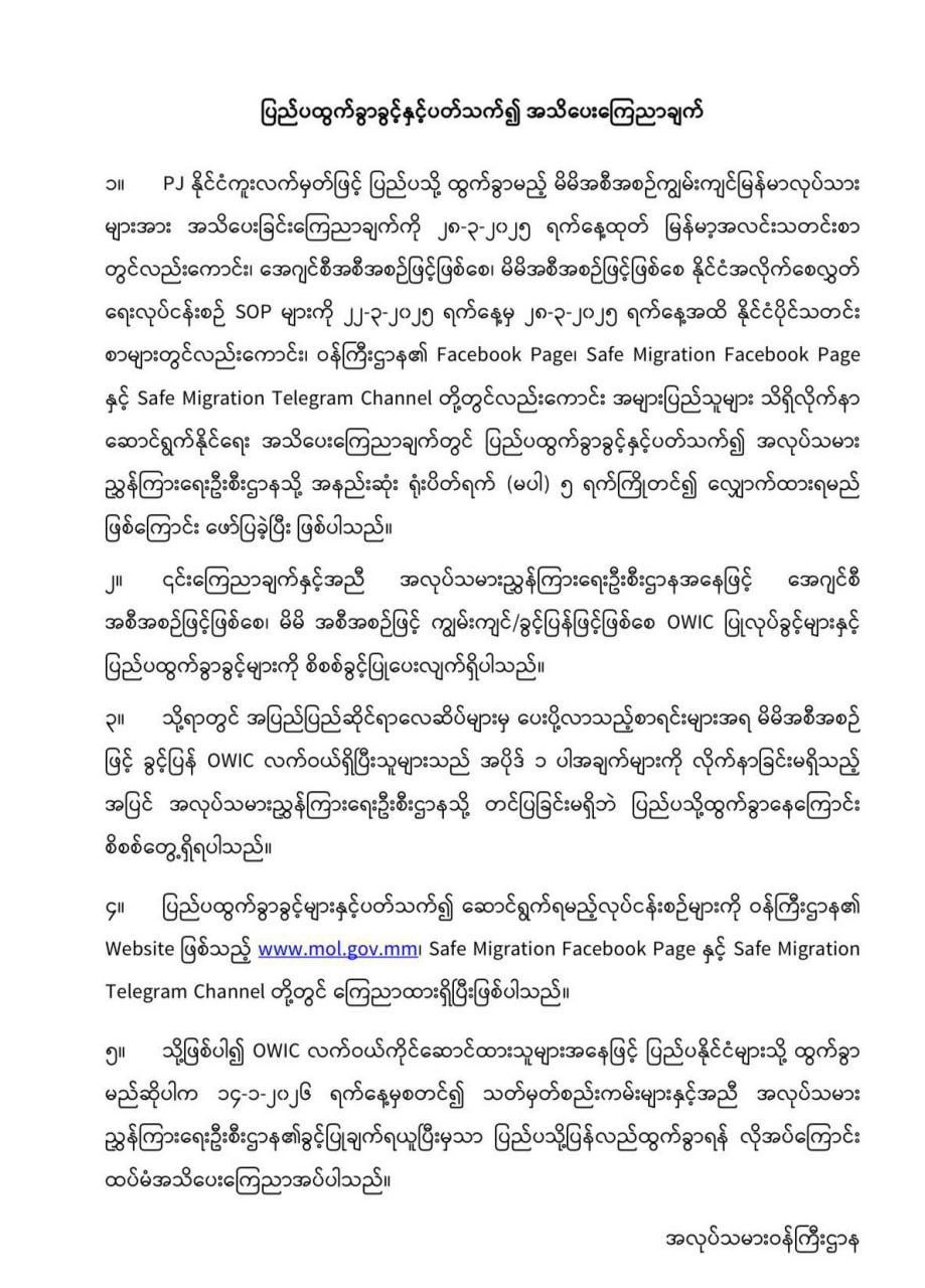 ခွင့်ပြန် OWIC လက်ဝယ်ရှိပြီးသူများ ပြည်ပပြန်လည်ထွက်ခွာခွင့်နှင့်ပတ်သက်၍ အလုပ်သမားညွှန်ကြားရေးဦးစီးဌာနသို အနည်းဆုံး ရုံးပိတ်ရက်(မပါ) ၅ ရက်ကြိုတင်လျှောက်ထားရမည်ဆိုသော သတ်မှတ်ချက်အား အလုပ်သမားညွှန်ကြားရေးဦးစီးဌာနမှ အသိပေးထုတ်ပြန်ခဲ့ပြီးဖြစ်သည်။