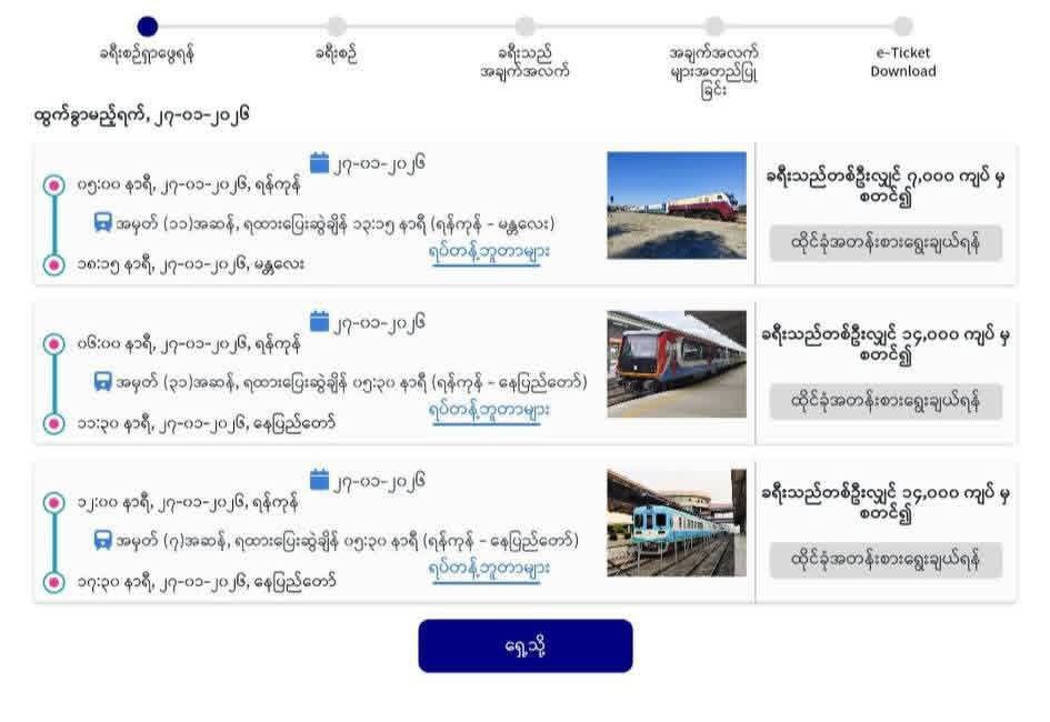 အွန်လိုင်းမှတဆင့် ရန်ကုန်-မန္တလေး၊ ရန်ကုန်-နေပြည်တော် ရထားခရီးစဉ်များအတွက် ဝယ်ယူနိုင်ကြောင်း သိရသည်။
