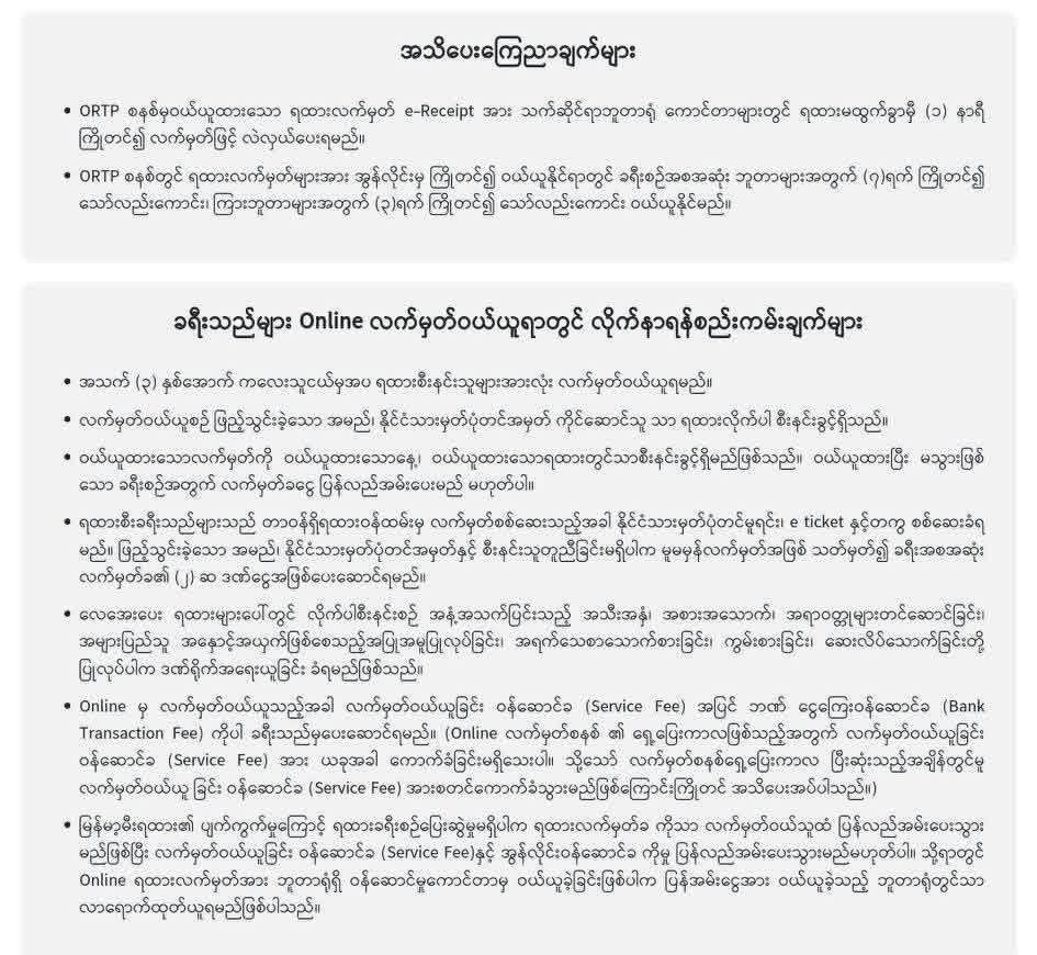အွန်လိုင်းမှ ဝယ်ယူထားသည့် ရထားလက်မှတ် e-Receipt ကို ရထားမထွက်ခွာမှီ ၁ နာရီအလို ကြိုတင်ပြီး သက်ဆိုင်ရာဘူတာရုံ ကောင်တာတွင် လဲလှယ်ရမည်ဖြစ်ကြောင်း သိရသည်။