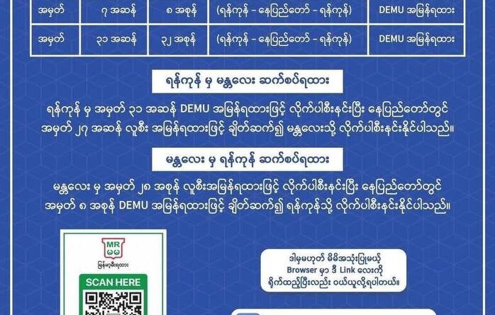 ရန်ကုန်-နေပြည်တော်-မန္တလေး လမ်းပိုင်း ရထားလက်မှတ်ကို အွန်လိုင်းက ဝယ်ယူနိုင်ပြီ