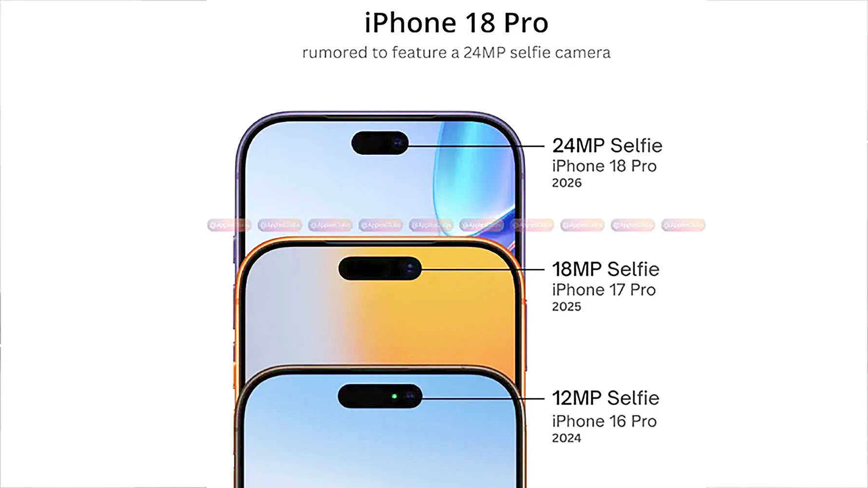 သတင်းပေးပို့သူ Whylab ရဲ့အဆိုအရ iPhone 18 Pro နဲ့ iPhone 18 Pro Max တို့မှာ 24 MP ရှိတဲ့ ရှေ့ကင်မရာတွေ ပါဝင်လာမှာဖြစ်ပြီး ဒါဟာ အရင်ထွက်ပေါ်နေတဲ့ သတင်းတွေနဲ့လည်း ကိုက်ညီနေပါတယ်။ ဒါ့အပြင် အာရုံခံကိရိယာအသစ်ကြောင့် Selfie ရိုက်တာ၊ ဗီဒီယိုခေါ်ဆိုတာတွေနဲ့ အလင်းရောင် အားနည်းတဲ့နေရာမှာ ရုပ်ပုံအရည်အသွေးတွေ ပိုမိုကောင်းမွန်လာစေမယ်လို့လည်း ဆိုပါတယ်။
