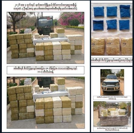 မကွေးတိုင်းဒေသကြီး၊နတ်မောက်မြို့နယ်၊ ရွာတော်စစ်ဆေးရေးဂိတ်၌ ရခိုင်ပြည်နယ်သို့ ပို့ဆောင်မည့် ကျပ် ၁၁.၇ ဘီလီယံတန်ဖိုးရှိ မူးယစ်ဆေးဝါးများ ဖမ်းဆီးရမိကြောင်း သိရသည်။