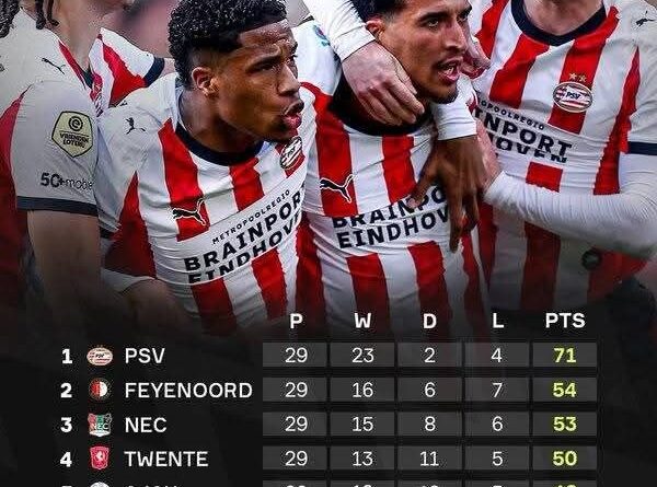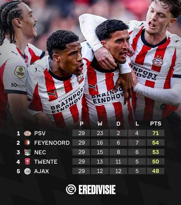 (၂၉)ပြဲ ယွဥ္ၿပိဳင္ကစားအၿပီးမွာ PSV အသင္းက ဒုတိယေနရာက ဖီယင္ႏုအသင္းကို (၁၇)မွတ္ျဖတ္ထားႏိုင္ခဲ့တာပါ။